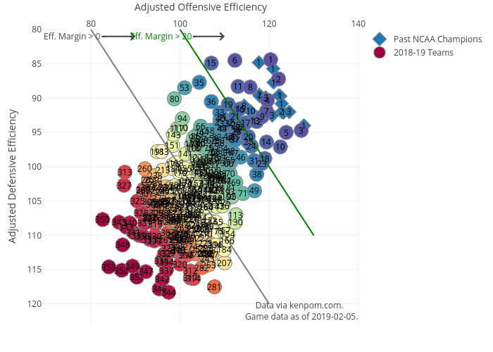I’ve updated my chart with the latest KenPom rankings AND I’ve now added the past NCAA Champions (2002-2018) as diamonds on the chart. It really stands out now that past champions have always had an efficiency margin of greater than 20 – or to the right of the green line.