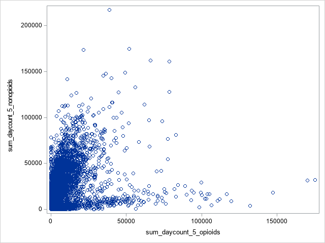 For example, we we were working with prescription details of opiate medications vs. other types from Medicare providers in NC. Each dot is a provider and the plot indicates the ratio of opioid prescriptions (x-axis) to nonopioid prescriptions (y-axis) by the total days of supply in the prescription. When plotted the data looks like this: