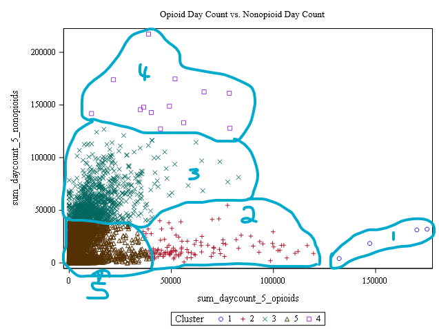 - Cluster 5 – The vast majority of providers that have relatively low rates of both opioid and nonopioid prescriptions