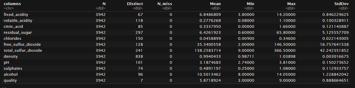 I ran this on the wine data set with “type” as the class argument and got these two tables. The first is for red wines the second is for white.