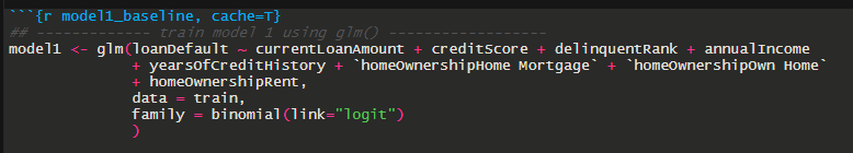 So on to a quick logistic regression to start as a baseline. Let’s work with the first few variables as they appear to be somewhat correlated. Credit score and term Short seemed to have a little correlation with each other, but not enough to worry about. So here’s the first pass at the model: